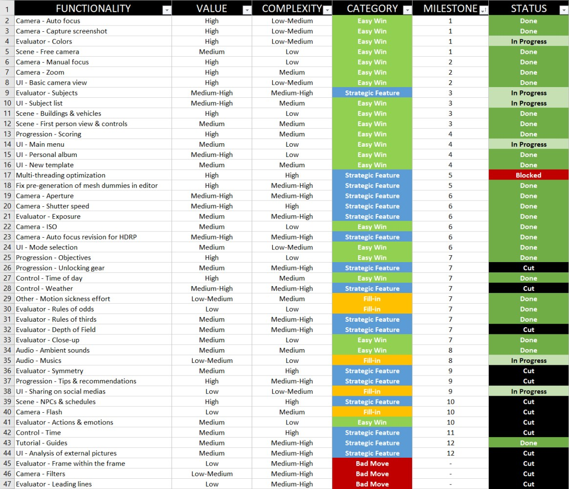Here the breakdown of Picturesque - a concept that revolved around the gamification of the photography. It’s a pretty simple Excel file that I used for tracking dependencies and my overall progress. I re-ordered items many times over the production – as I was experimenting with new mechanics, and facing unexpected challenges.