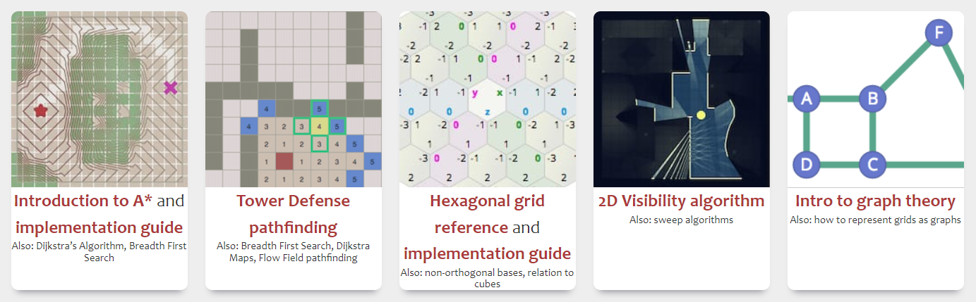 Red Blob Games is a website I used for many of the prototypes I worked on. Amit Patel experiments with all kinds of features such as AI pathfinding, hexagonal grids, polygonal maps generation, 2D visibility algorithms... He shares his entire code, and he explains his discoveries in an interactive and very enjoyable way: the website is both educational and inspiring. I always keep a look at it, and I sometimes brainstorm concepts from the tutorials themselves.