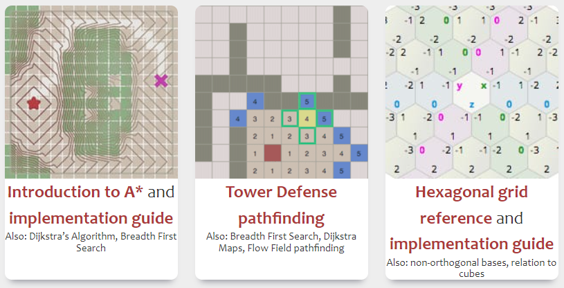 Red Blob Games is a website I used for many of the prototypes I worked on. Amit Patel (the author) experiments all kinds of features such as AI pathfinding, hexagonal grids, polygonal maps generation, 2D visibility algorithms... He shares his entire code, and he explains his discoveries in an interactive and very enjoyable way: the website is both educational and inspiring. I always keep a look at it, and I sometimes brainstorm concepts just based on these algorithms. |